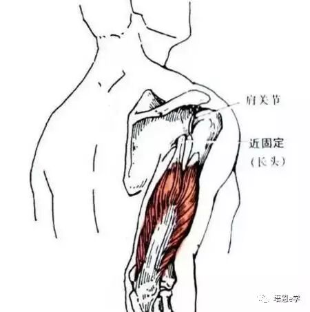 近固定时,使肘关节伸,长头还可使肩关节伸;远固定时,使上臂在肘关节处伸。