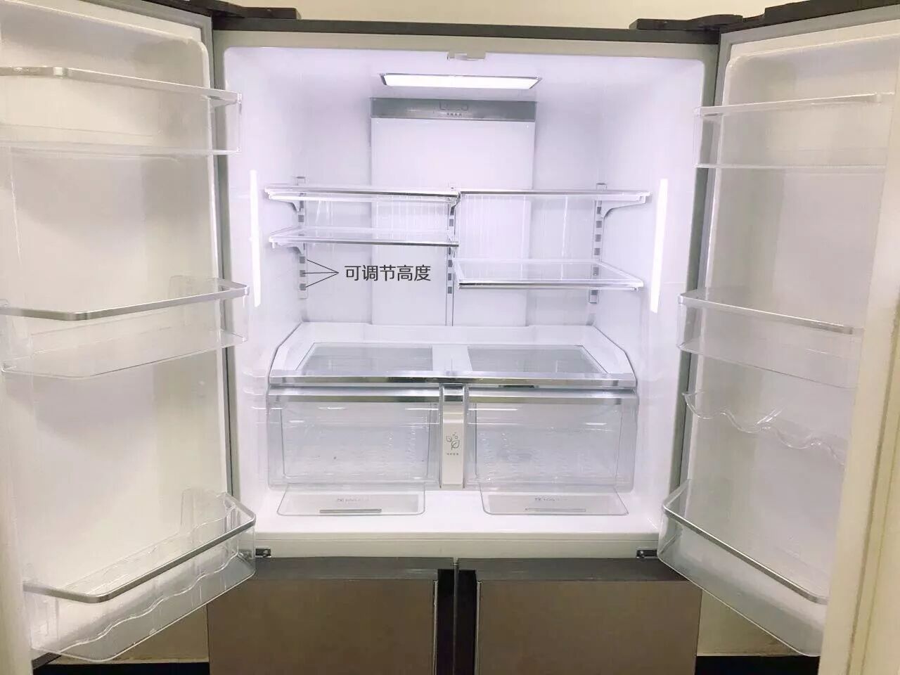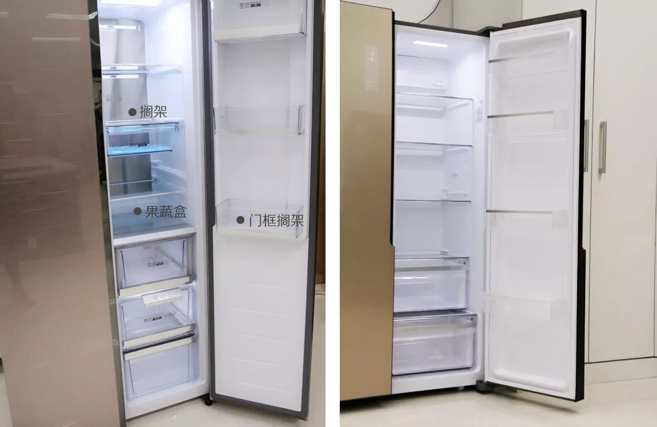 2、对开门冰箱的冷藏室结构大致相同,由数层搁架和2-3个保鲜盒组成。搁架高度可调,而且可调范围较大。门框上同样有分层的搁架。