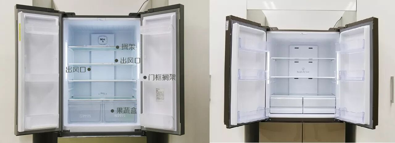 1、普通的三门、双门、多门冰箱冷藏室结构是由搁架和保鲜盒组成。一般为2-3层搁架,高度可小范围调节,可调范围在10cm之内。保鲜盒一般都是分成2个。门框上搁架基本是2-3层。