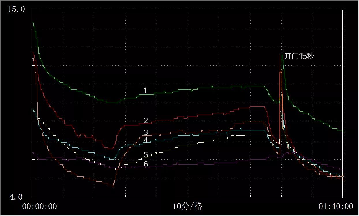 曲线2、6:门框搁架的温度在开门前后是波动最大的,也就是说门框搁架的温度是整个冷藏室最不稳定的;
