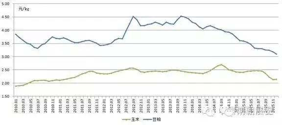 全国玉米、豆粕月度价格(2010.01-2015.12)