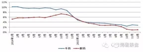 牛奶、酸奶价格同比涨幅(2014.01-2015.12)