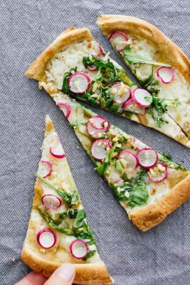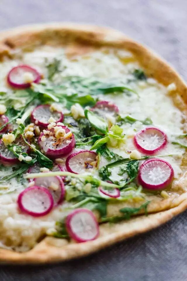 第一步:将萝卜切成薄片,将青菜切碎,放到披萨饼面包上。放一层撒一圈芝士、奶酪,最后将松子撒在最上面。