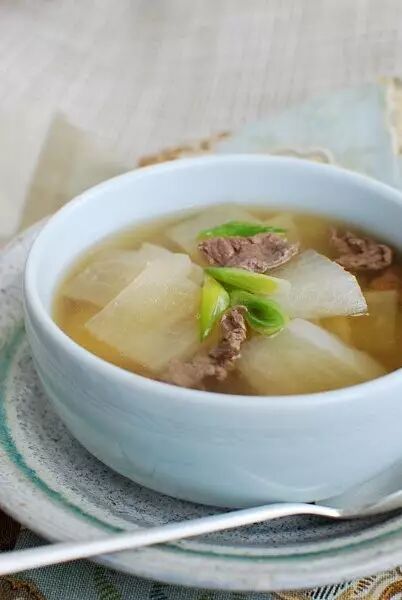 准备:萝卜、牛肉、大蒜、芝麻油、酱油、盐、胡椒粉等