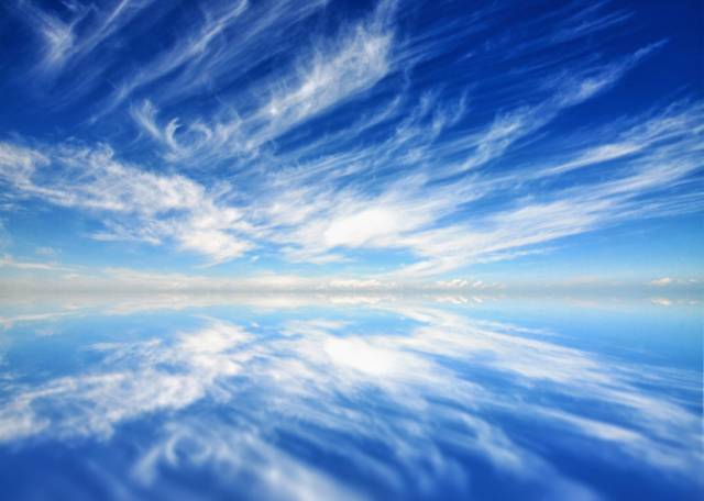湖面将天空、云朵和对岸的山都倒映在湖里。