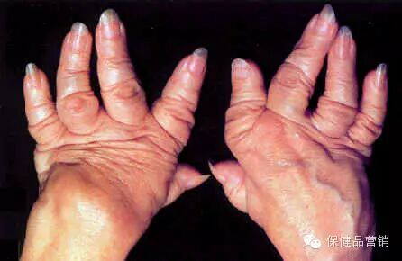 手:疼痛、肿胀、手指僵硬、弹响指或指、指间关节结节、弯曲形成蛇样畸形等。