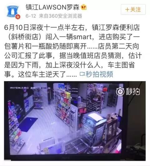 12号下午,镇江一家便利店官方微博发布消息称,“6月10号深夜十一点半,镇江罗森便利店斜桥街店,闯入了一辆smart车,进店购买了一包薯片和一瓶酸奶随即离开。”并上传了当天晚上的监控视频。