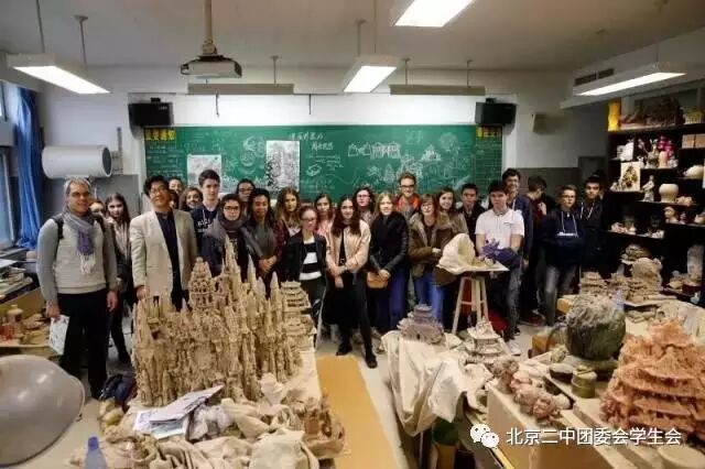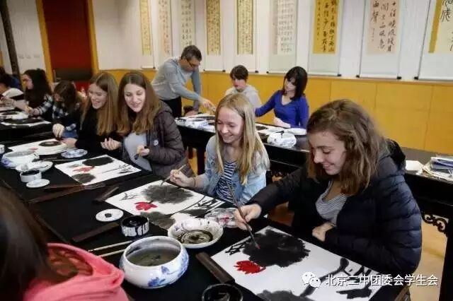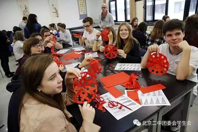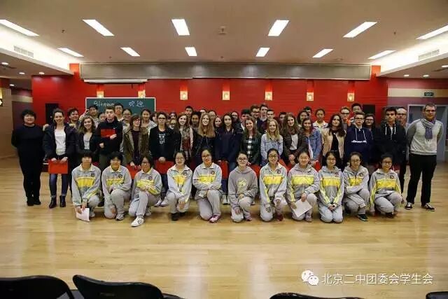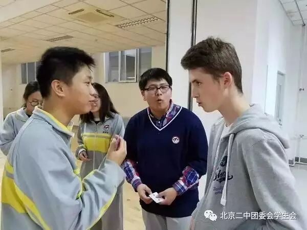 每个学期,北京二中都会迎接数批来自国外友好学校的师生。他们来自丹麦,法国,哥伦比亚等不同国家,其中有些还会留宿在我校学生家中,利用周末等空余时间游览北京城的名胜古迹,品尝老北京的风味小吃。 另一部分则会和同学们一起进行为期半天的学习,和同学们共进午餐,体验我校学生的校园生活。来自哥伦比亚的学生还和我校的足球队举行了友谊赛,共同切磋球技。