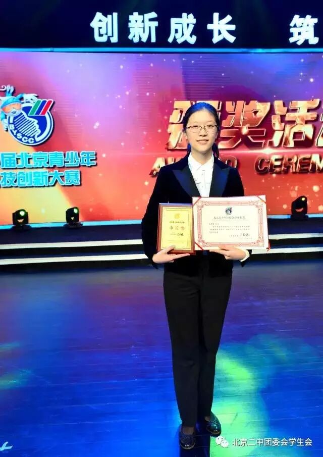 北京二中高二年级学生王淳荣获工程学一等奖,王安然荣获行为学和社会科学一等奖及北京工业大学专项奖,高一年级学生姜睿希荣获工程学一等奖。