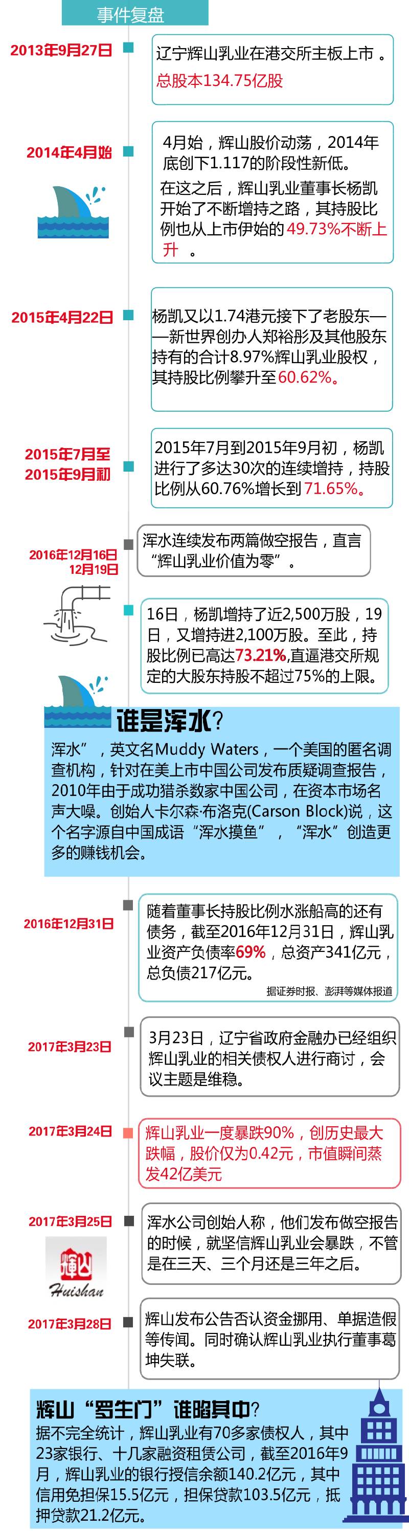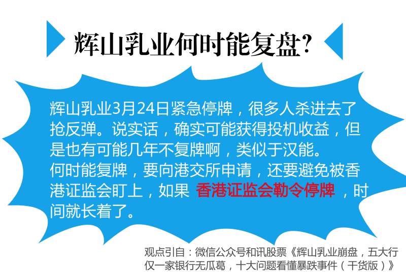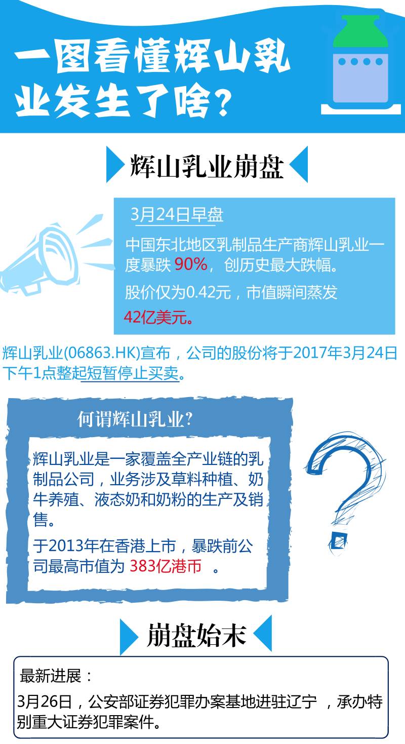 3月24日,在香港上市的东北企业——辉山乳业(06863.HK)股价闪崩,以2.8元开盘,上午11点半出现高空跳水,午盘收盘跌幅略有收窄,股价报0.42港元/股,跌幅高达85%,市值一天蒸发300多亿元。