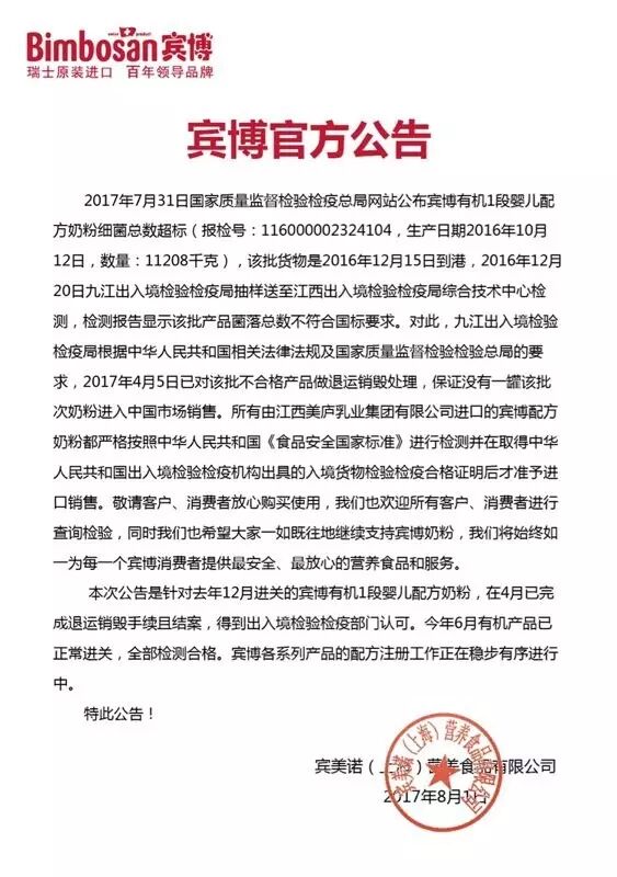 昨日,了2017年6月未予以准入的食品化妆品信息。其中,由江西美庐乳业集团有限公司进口的瑞士宾博有机婴儿配方奶粉,因细菌总数超标不得入境。对此,今天宾博发布以下声明: