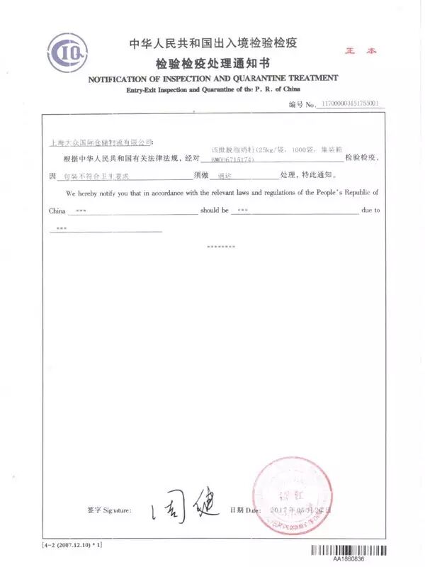 上海晋富经贸发展有限公司提供的检验检疫处理通知书