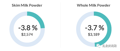 全脂奶粉价格下跌3.7%,最新价格为3189美元/吨;脱脂奶粉下跌3.8%,平均价2574美元/吨。
