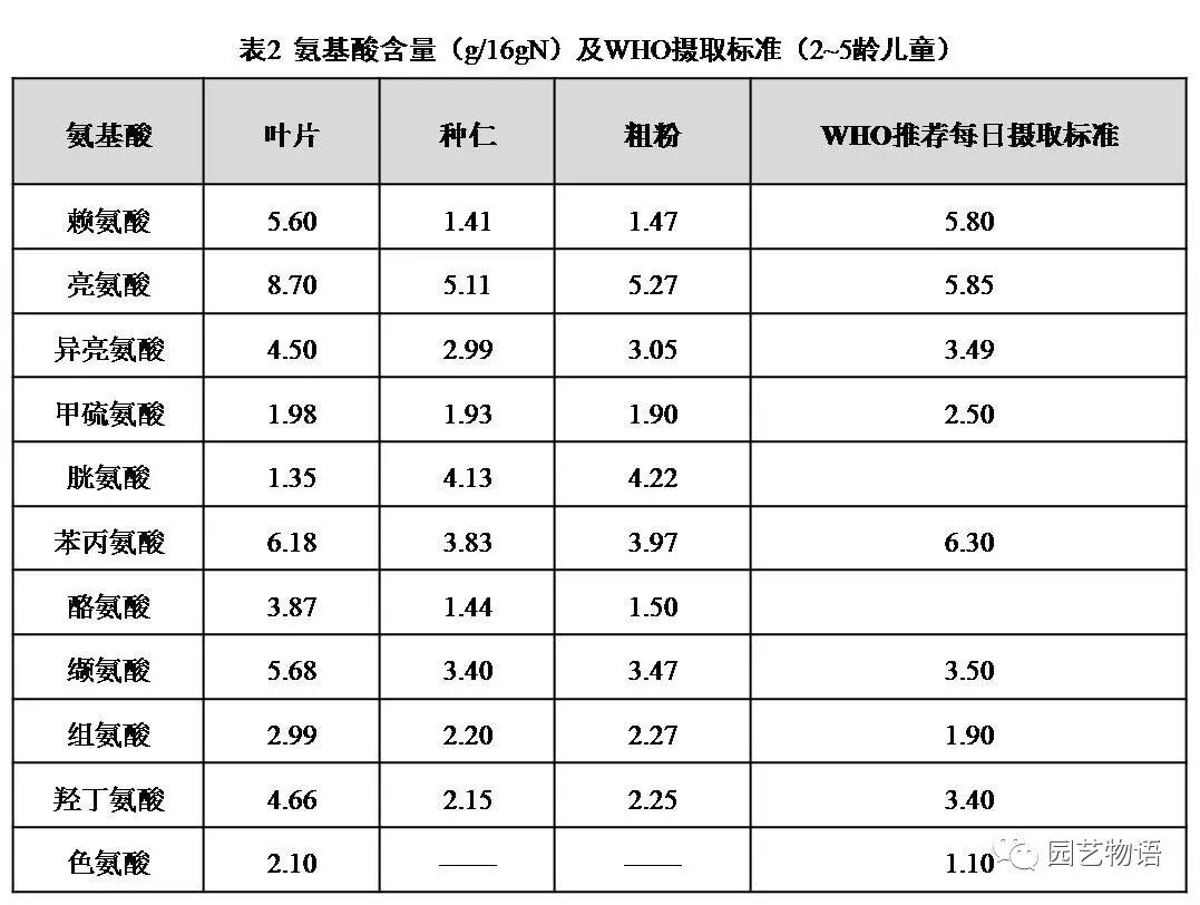 科学家通过试验测定发现在新鲜辣木树叶6.7g/100g所含的蛋白质超过菠菜2.8g/100g,两倍之多,而且含有的正是人体必备的八种氨基酸,为完全蛋白质(表2)。