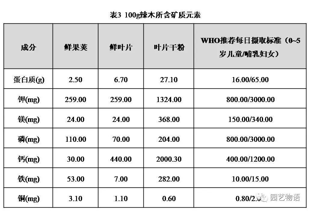 辣木树的矿物质包括钙、镁、磷、钾、铜、铁、硫。其中每一百公克新鲜辣木树叶的钙质为440mg,是相同重量牛奶钙质120mg的四倍;每一百公克新鲜的辣木树叶的铁含量为7mg,是相同重量菠菜铁2.1mg的三倍多,所以食用辣木树产品,就能补充我们生活中容易欠缺的矿物质(表3)。