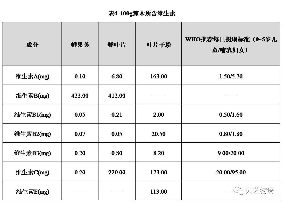 社会经济发展和进步,人们的饮食型态有相当大的改变,现代人在蛋白质,脂肪与糖类摄取过多,但维生素与矿物质摄取不均衡,其中维生素B1、B2、B6、E的平均摄取量极容易低于正常值。健康的身体来自营养的均衡,辣木树潜藏丰富的维生素,可以补足日常我们容易欠缺的营养素(表4)。