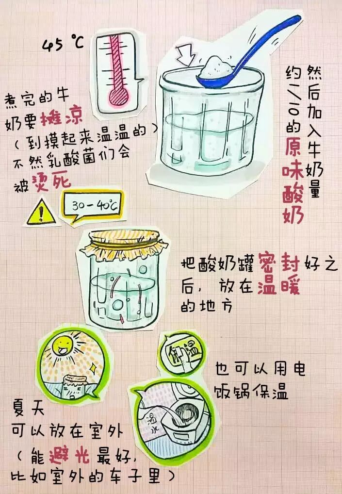 乳酸菌和我们一样是有生命的,所以加入乳酸菌的时候一定要确保牛奶温度不要过烫(能够拿起容器在手里捧个10秒钟左右)。不然把乳酸菌烫死了,牛奶放那发酵放到坏了也做不出酸奶来的。