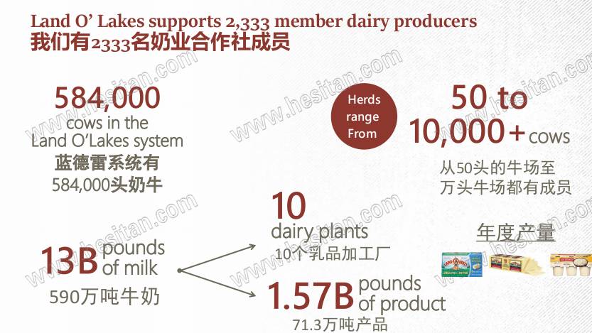 蓝德雷目前是全美国第二大农业合作社,业务遍布50各州及60个国家,是美国500强企业,全球总计一万名员工。蓝德雷合作社拥有2000多名合作社处成员,不光提供动物营养饲料,也提供相应服务。合作社总计有58万多头奶牛,服务的牧场奶牛存栏从50头至1万头都有,每年加工的牛奶量590万吨,相当于年奶源生产总量的1/6。有总计10个乳品加工厂,加工的乳制品主要是奶酪和黄油。