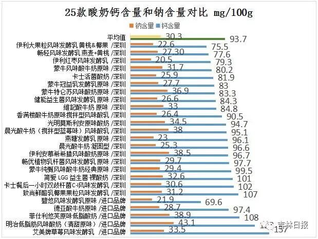 本次25款酸奶中,钙的平均值为93.7 mg/100g,钠的平均值为30.3 mg/100g。其中钙含量最高的为137 mg/100g;钠含量最低的为20.5 mg/100g。
