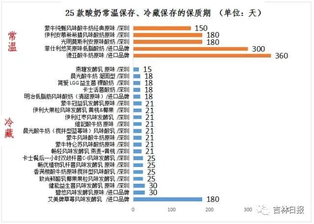 常温的酸奶保质期天数最短的为150天,是国产品牌蒙牛纯甄风味酸牛奶经典原味;最长的为360天,是进口品牌德亚酸牛奶原味。