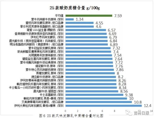 以下数据表明,在本次的25款酸奶中,蔗糖含量的平均值为7.59 g/100g。其中蔗糖含量最高的为12.4 g/100g,最低的为1.34 g/100g。