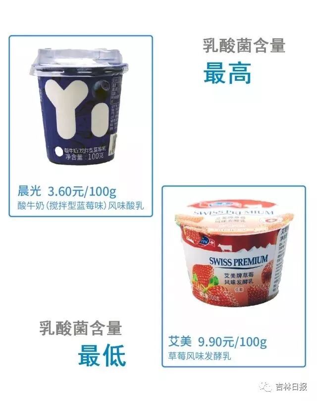 其中,乳酸菌数最高77亿CFU/g,为晨光的酸牛奶(搅拌型蓝莓味)风味酸乳。 其中进口品牌艾美草莓风味发酵乳乳酸菌含量只有1900万CFU/g。