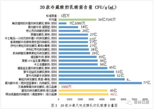 本次20款冷藏酸奶中,乳酸菌含量平均值为34亿7145万CFU/ g(mL),整体优于国家限量要求的100万 CFU/g(mL)。