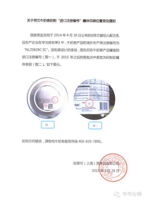 ,牛奶客产品的境外生产商注册编号为”NLZ0828C EC“因包装设计变动,原先印在牛奶可产品罐底的注册编号,于2015年之后的各批次中更改为印制咋罐体表面。