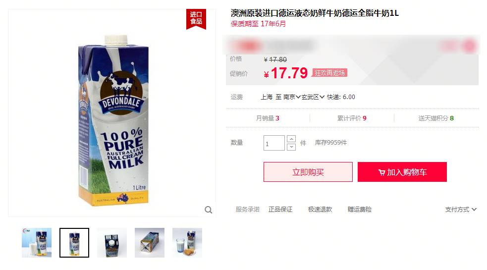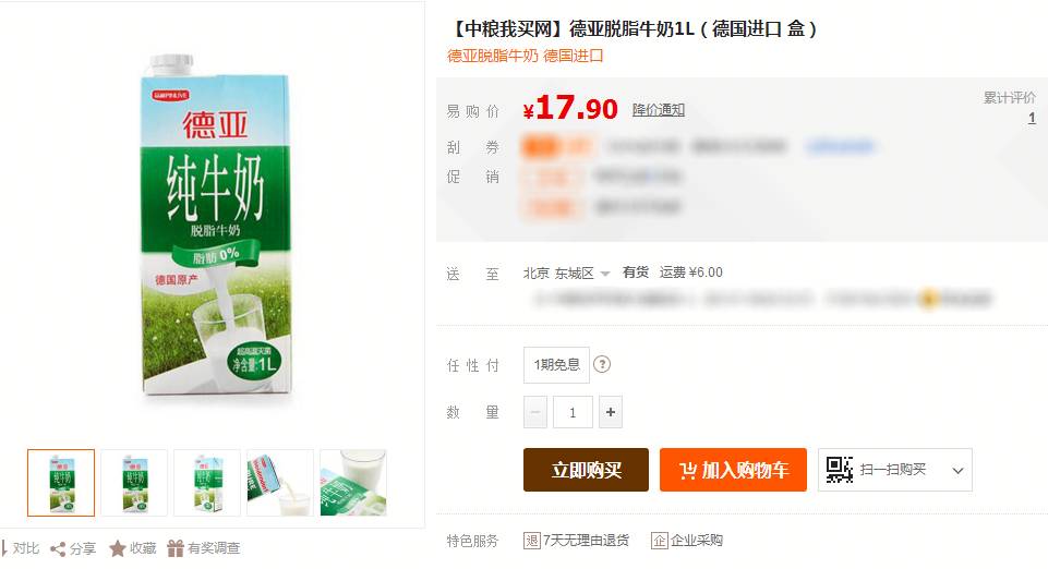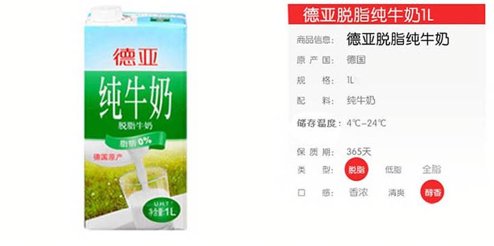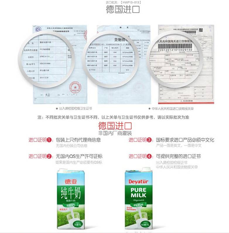 德亚脱脂/全脂/低脂牛奶1L(德国进口)