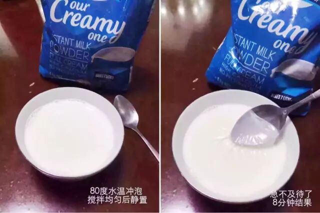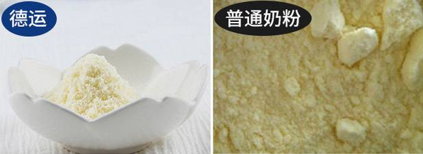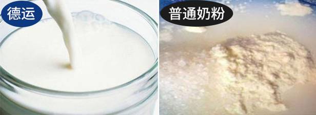 还记得小时候是爱吃未完全溶解的奶粉。殊不知这类奶粉(图右)溶解差,不利于身体吸收。德运奶粉溶解快,即使用凉水也能冲开,营养成分在很大程度上被人体吸收。