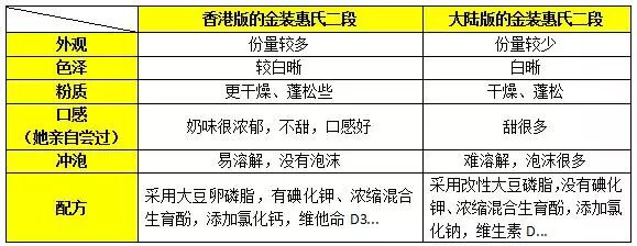 还有一位广州妈妈比较了港版的与大陆版的惠氏二段的金装健儿乐900克罐装后说,“感觉港版的与大陆版的确实有区别!”据她介绍,区别如下: