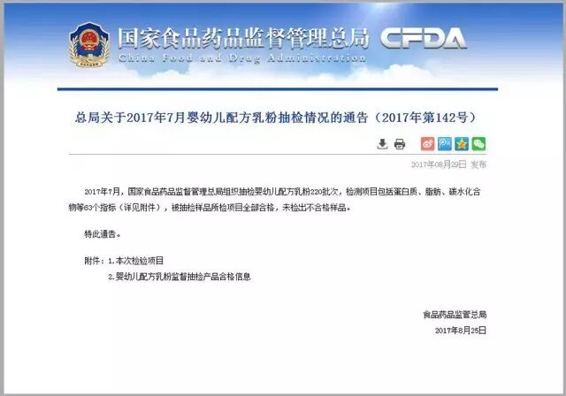 【概要】8月29日,,7 月份抽检的 220 批次婴幼儿配方乳粉全部合格,这意味着 2017 年 1-7 月奶粉抽检合格率达到 99.54% 。