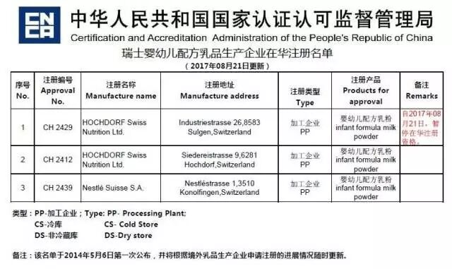 【概要】8月21日,国家认监委宣布,瑞士奶粉厂HOCHDORF SwissNutrition Ltd自2017年08月21日,暂停在华注册资格。起因是最近至少3家该公司生产的奶粉品牌不合格。