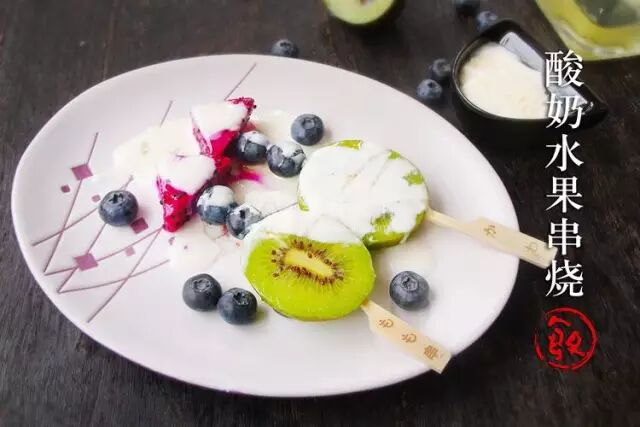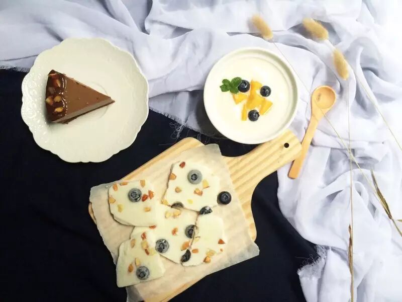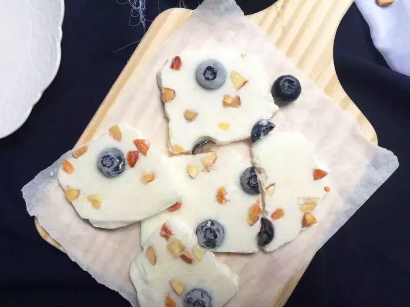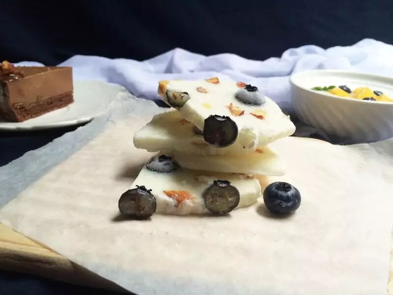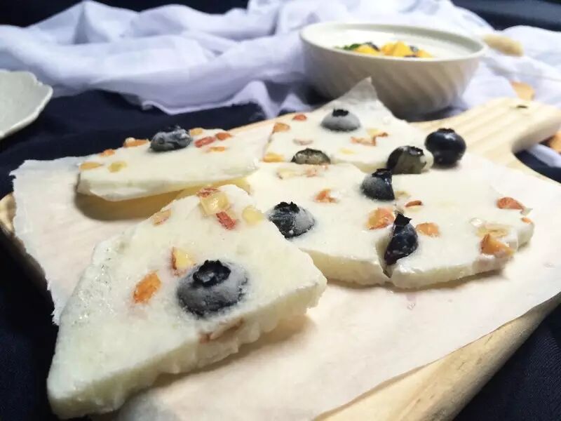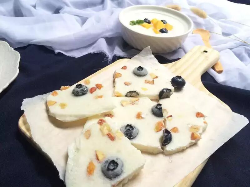 “小烤盘铺上一层吸油纸,把酸奶倒在上面,再撒上些水果,冷冻四个小时即可。天气热记得冰箱拿出来尽快吃哦~ ”