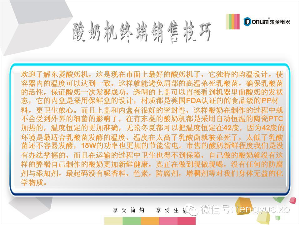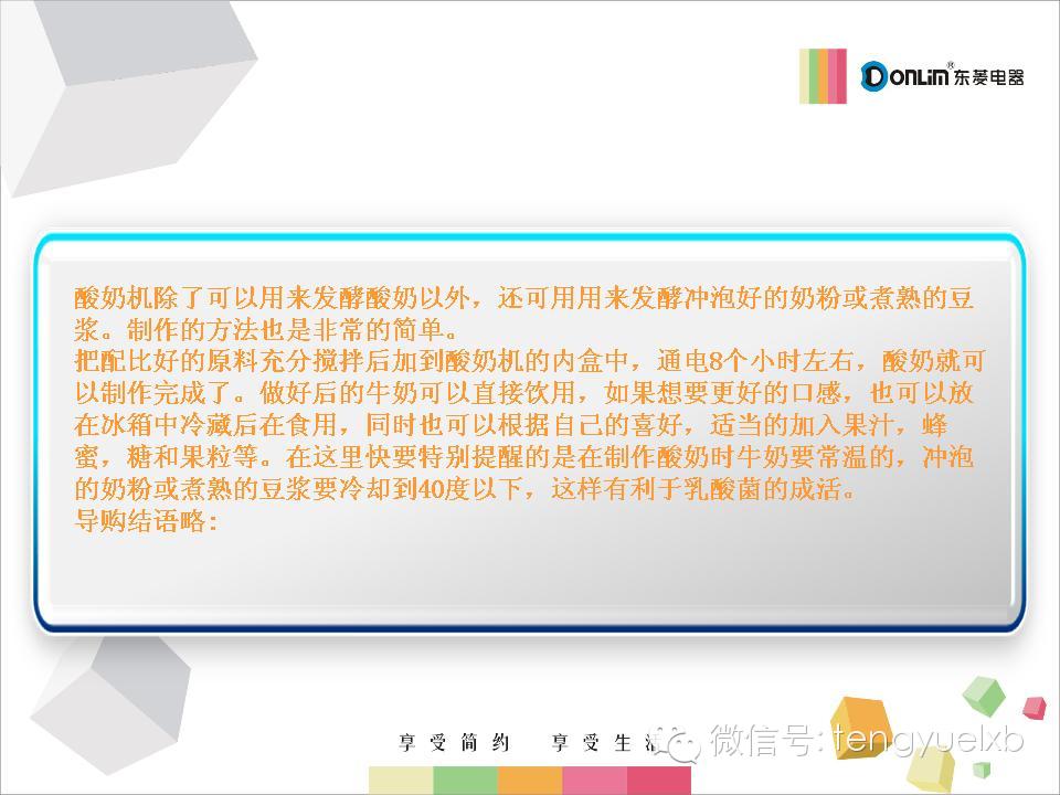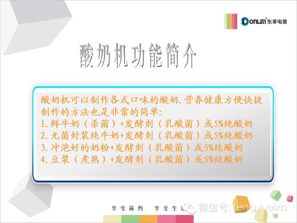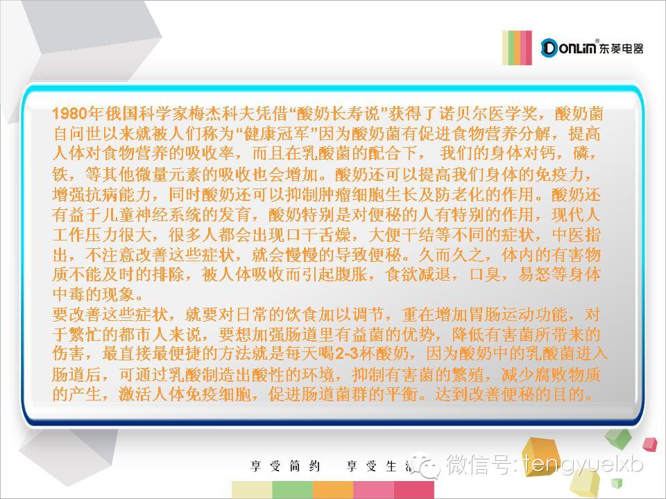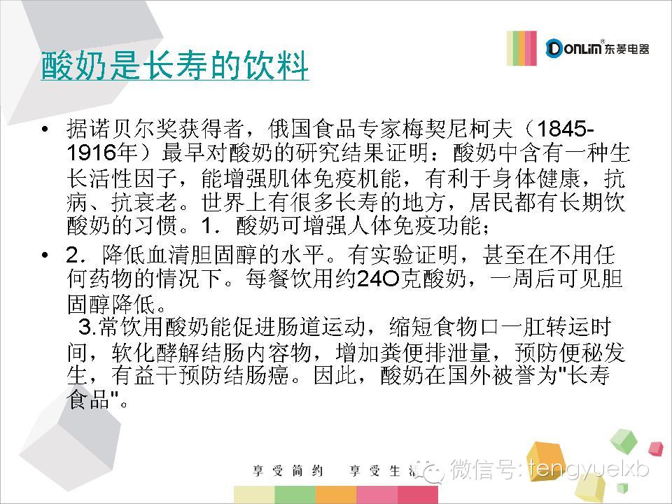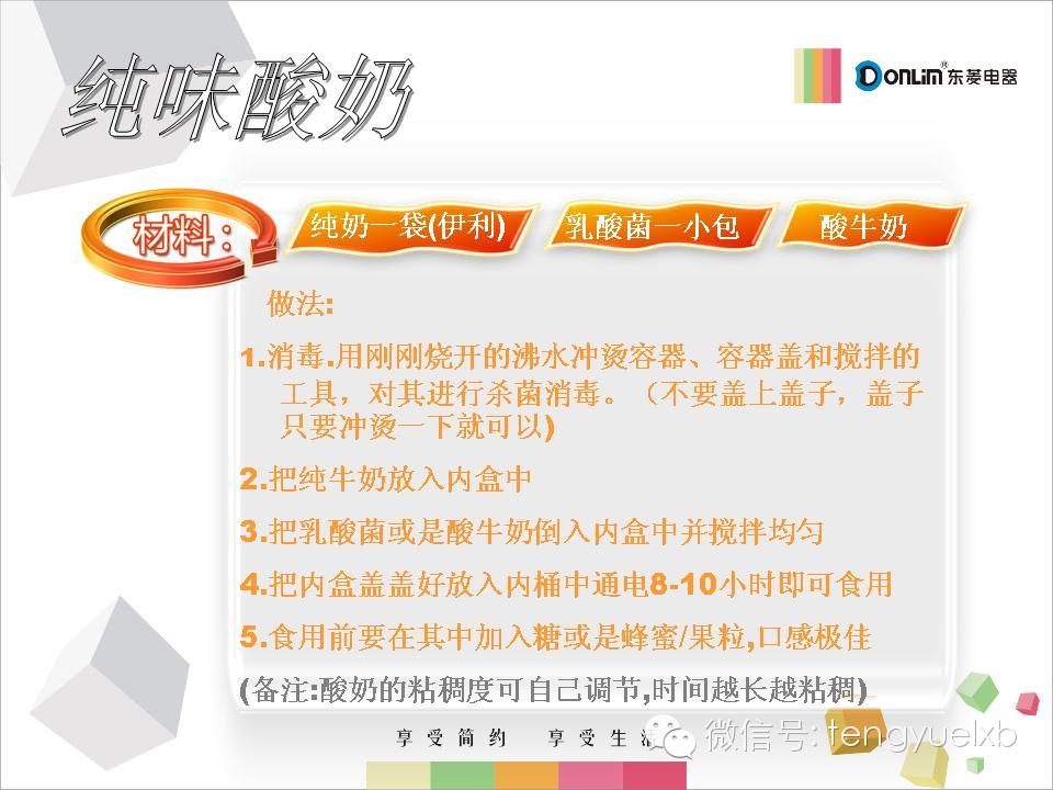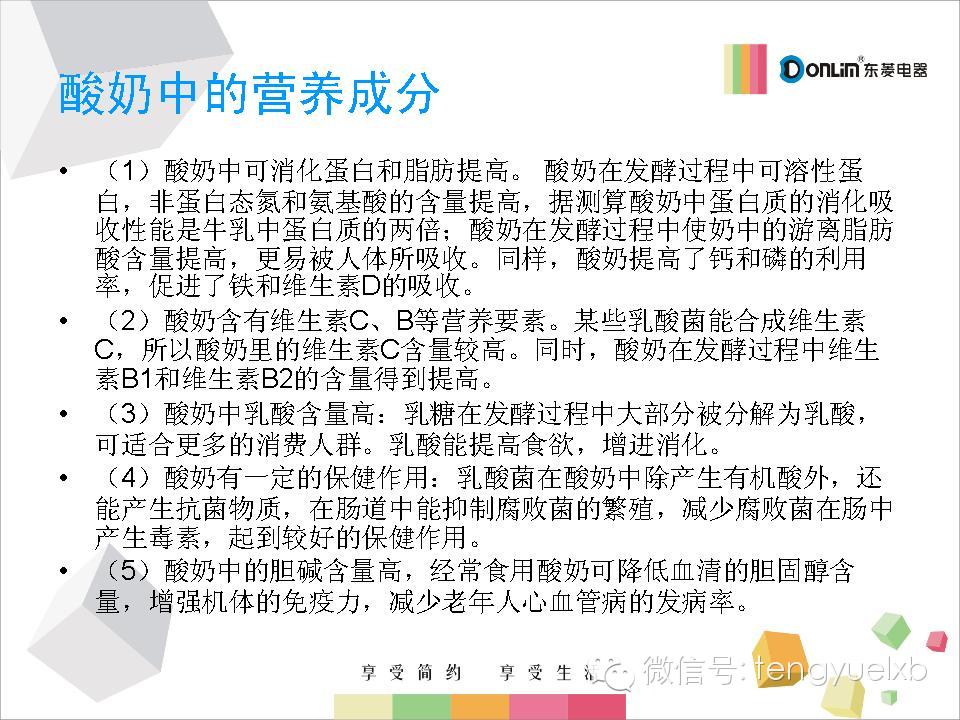 【九类人家中要常备东菱酸奶机】酸奶由纯牛奶发酵而成,既保留了鲜牛奶的营养,在发酵过程中还可产生人体所必须的多种维生素,如VB1、VB2等。9类人常喝酸奶益处更多: ①乳糖不耐受者;②糖尿病患者;③高血压患者;④服用抗菌素者;⑤骨质疏松患者;⑥消化不良者;⑦便秘人群;⑧口臭的人;⑨免疫力低下者。
