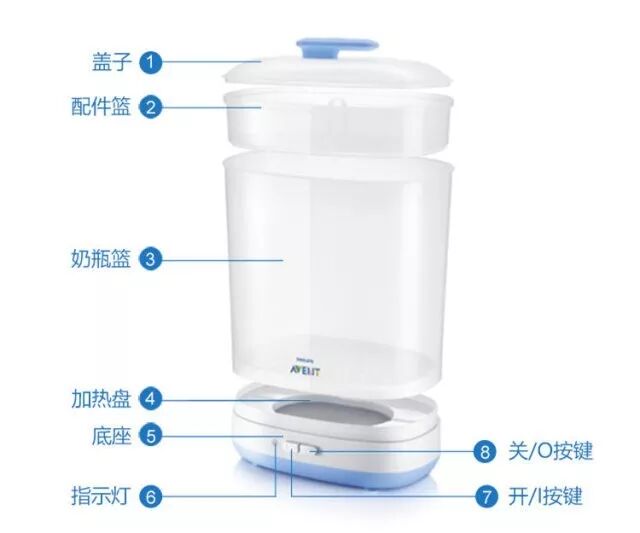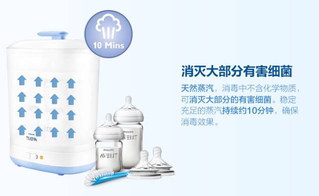 天然的蒸汽过程,在消毒过程中不产生任何化学物质。只需经过10分钟的持续蒸汽,就可确保奶瓶的无菌无毒。