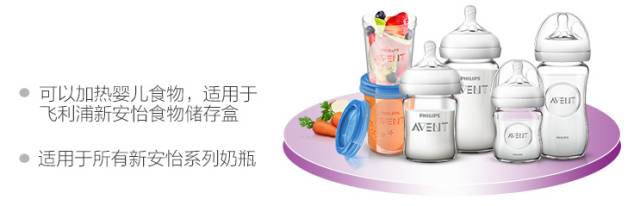 飞利浦新安怡蒸汽消毒锅适合所有标准口径及宽口径的奶瓶,即使不是新安怡的奶瓶,只要有可蒸汽消毒标识的奶瓶,它都可以进行消毒。还可同时消毒5只奶瓶,办事快,效率高。