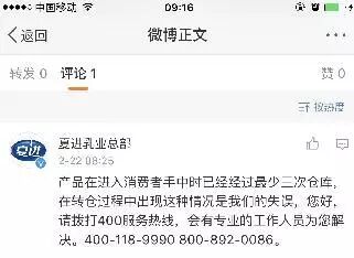 微博发出次日,@夏进乳业总部 通过官微回复该网友:“产品在进入消费者手中时已经经过最少三次仓库(储),在转仓过程中出现这种情况是我们的失误。您好,请拨打400服务热线,会有专业工作人员为您解决……”