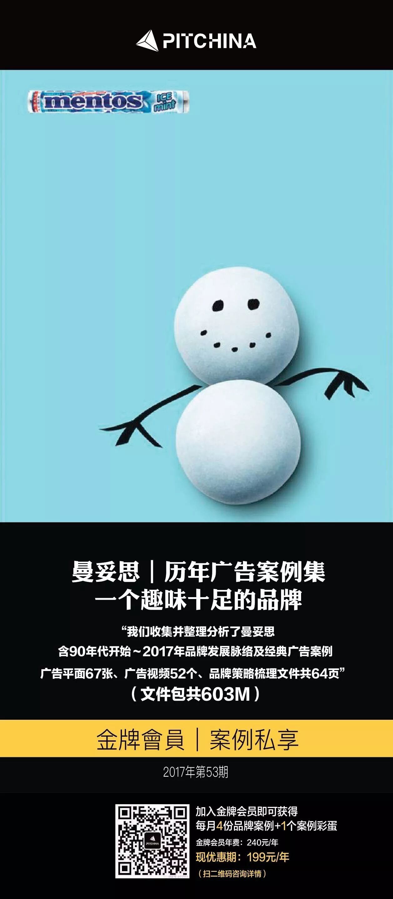 每周三推案例集到您邮箱,每月4份品牌案例+一个彩蛋,都是邮箱领取,内容主要是品牌历年案例集,内含PDF品牌传播策略梳理、广告视频、广告平面、事件营销等,整理的内容有策略方面的思考。另有PITCHINA主办线下案例分享会,会员优先报名和会员优惠。