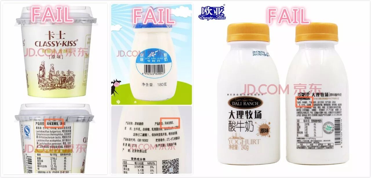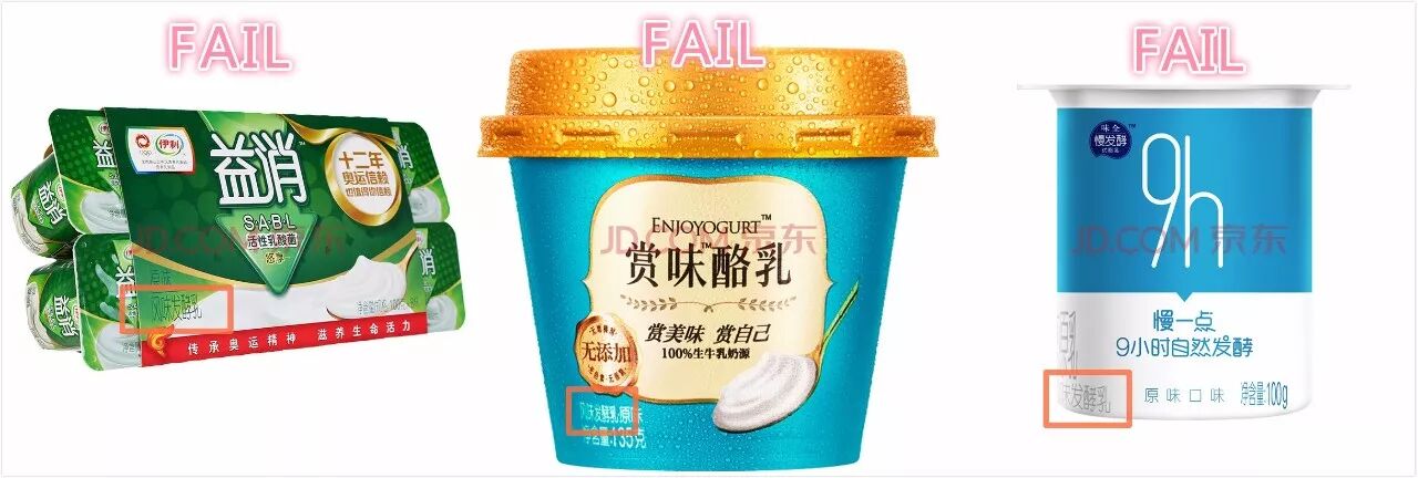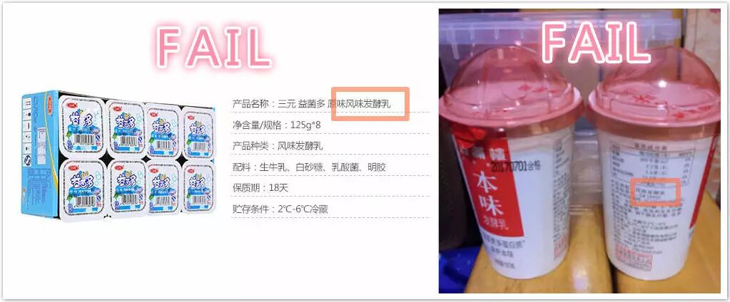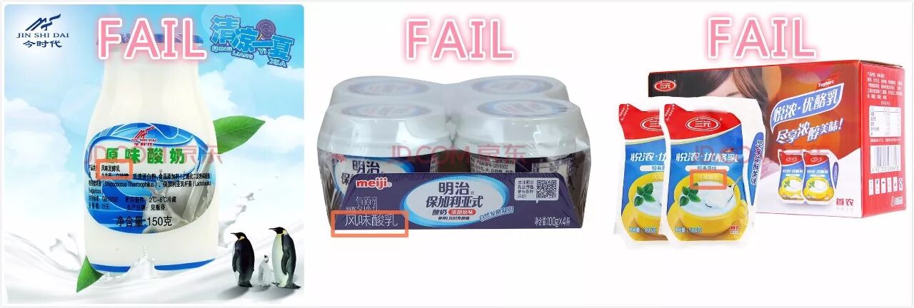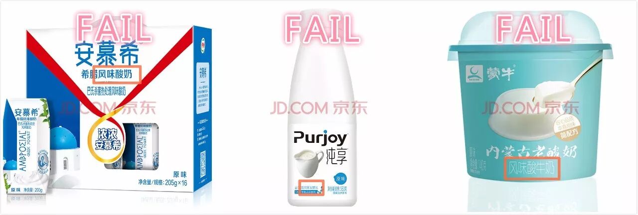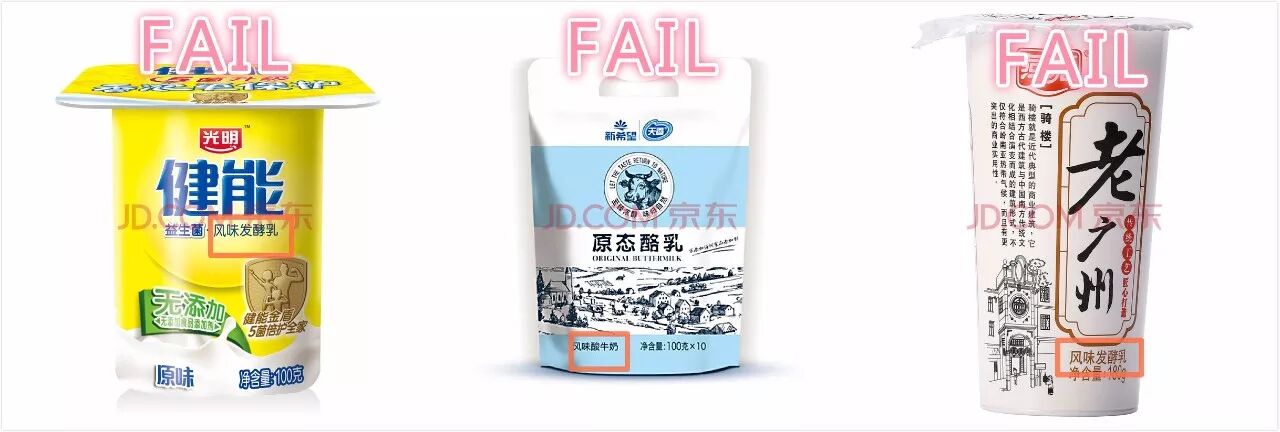 打开某电商,搜索“原味酸奶”,看了下外包装,含“风味”二字的下面这些全都挂掉了,FAIL。要注意啊,有时候“风味”二字写在非常隐秘的位置,名称是原味酸奶,甚至有些标明“无添加”,但仔细一瞧,某个角落印着“风味”呢。