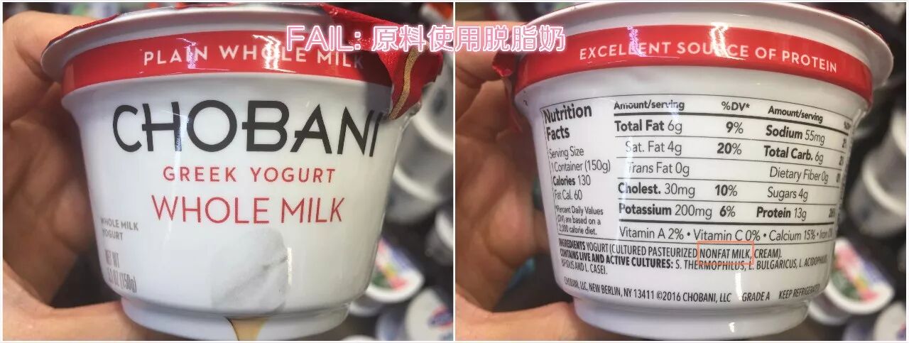 首先看包装:我们追求全脂无添加,那么包装上不应该出现“Non-fat”、“Low-fat”、“Fat free”、“2% fat”、“0% fat”之类,也不应该出现“Style”(类似中国包装里的“风味”),应该显示Whole Milk。