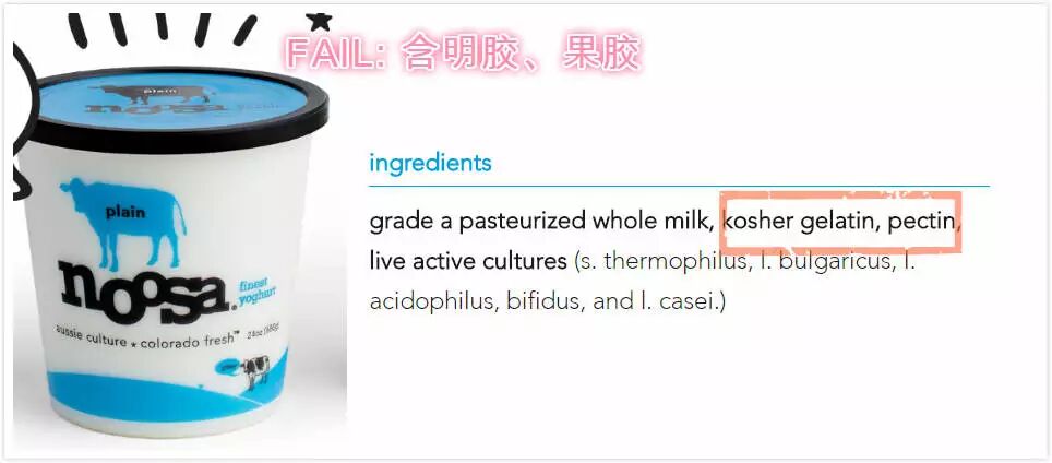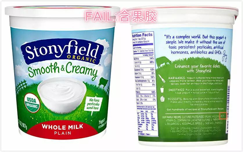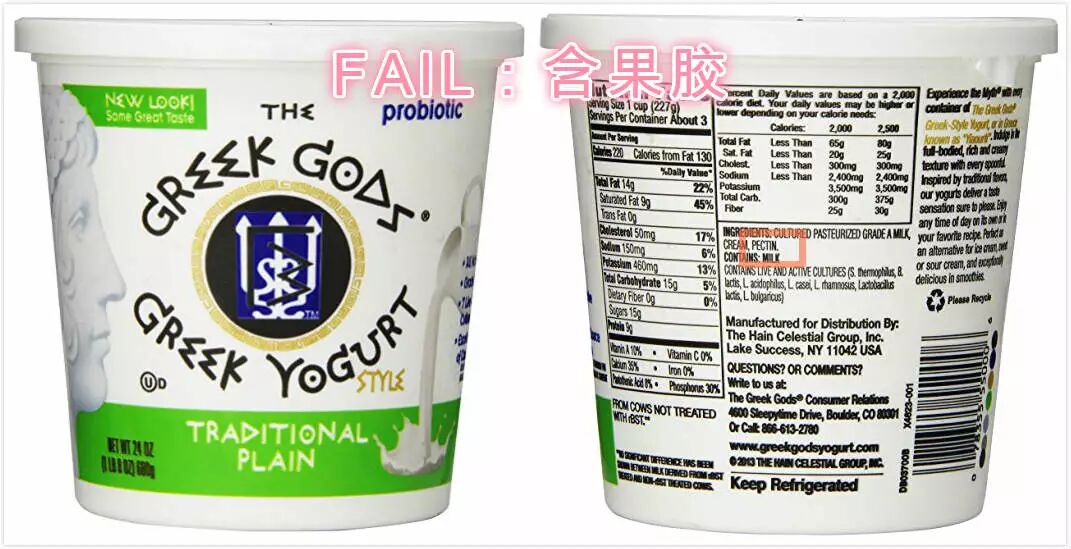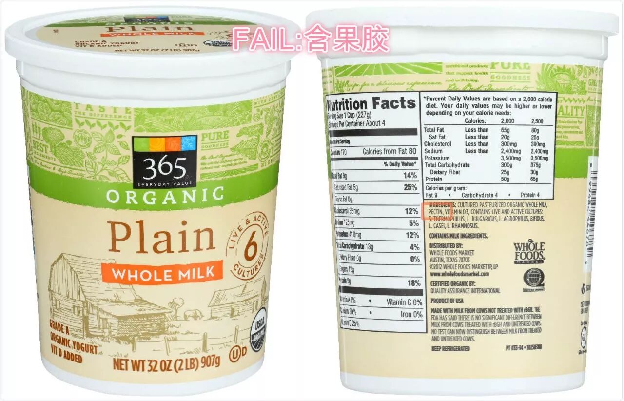 美国的Plain Yoghurt 相比较国内的原味酸奶,配方要单纯的多,但很多还是添加了"胶 Pectin"。