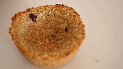 PS:如果没有预热功能最好先预热3分钟。这个燕麦杯烤制的时间,需要根据燕麦和香蕉的比例适当调整,如果做的燕麦果泥比较稀,烤的时间就要相对长一些,直到燕麦杯成型即可!这个只要守在烤箱前,防止烤糊,判断一下烤制的状态就可以,成功率很高呢!