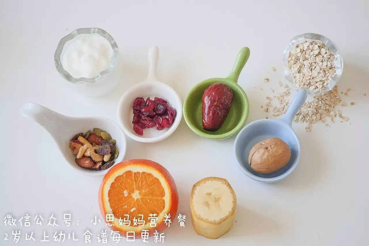 准备食材:香蕉50g,即食燕麦30g,蔓越莓2g,酸奶适量,橙子半个,大枣1个,核桃1个,各种坚果适量。