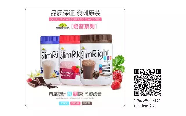 想减肥就要管得住嘴,迈得开腿!只是单纯的运动并不会让你变瘦,你必须控制饮食。然而节食并不如代餐,代餐产品是通过精准控制卡路里的摄入来管理体重。对很多人来说,代餐最大的好处是每天不用纠结要吃什么,该吃多少,营养是不是足够。繁忙之余,冲杯代餐产品就可以轻松瘦身。那么,林林总总的代餐产品该如何选择呢?澳洲Channel 9电视台推荐了其本土值得信赖的澳洲SlimRight纯天然代餐奶昔。SlimRight是PharmaCare澳葆公司旗下澳洲领先保健品牌Nature’s Way绿之华的瘦身子品牌。 Nature’s Way得益于澳洲洁净的自然环境、严格管控的产品品质,在澳洲市场家喻户晓,甚至成为澳洲家庭和游客必买的保健品品牌。奶昔最大的特色是加入了菊粉,菊粉提取自菊苣是最好的植物纤维来源,它不仅能有效的排毒和分解脂肪,还能同时在肠道上形成一层粘膜,抑制糖分吸收。用奶昔代替任意两顿正餐,其含量有充足的蛋白质与膳食纤维,能让你饱腹的同时,补充丰富的维生素,保证减肥的过程中不会营养缺失。奶昔的正确冲调方法是用2大勺约35g的奶昔,加入250ml的脱脂牛奶或无糖豆奶。虽然使用水冲调的奶昔热量只有123卡路里,但其实加入了脱脂牛奶的奶昔能提高蛋白质、钙、磷、镁、锌、维生素B12等营养物质和微量元素的摄入,热量也只有212卡路里,在我们日均总摄入量1200卡的范围以内 。大家也可以使用暖暖的脱脂牛奶或者微波炉加热奶昔,都不会影响奶昔的营养成分变化。 作为被电视台推荐的瘦身品牌,不仅是因为SlimRight奶昔瘦身安全且效果好,更关键的是SlimRight提供了一套简单易行的体重管理解决方案——123计划。1餐正餐 +2餐奶昔+ 3次健康零食的搭配,将每日能量摄入维持在1200千卡左右,低于成年女性每天需摄取的1800千卡,并提供充足营养,不损害健康。坚持123计划,四周可瘦4-6kg,十周可瘦10-15kg。心动了吗?扫描/识别下图中的二维码就可以把代餐奶昔带回家啦!(点击文章末尾的“阅读原文”也可以直达购买哦~)对,经过一段时间的努力,我们在澳洲建立了团队和仓库,直接将好的产品给您直邮到家哦!在开通直邮的产品页面,下单时选择直邮就可以啦,比如今天的这款澳洲奶昔!另外,如果您有其它需要澳洲直邮的产品,也可以咨询客服帮您询问价格哦~碎碎念:直邮时间较国内现货长,通常为7~15天,下单后不予退换,瘦司们理解哦!↓↓↓点击阅读原文直达SlimRight奶昔和好身材
