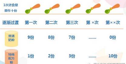 当宝宝确诊牛奶蛋白过敏必须换特殊配方奶粉时,不能从某一时刻开始突然断掉以前的食物,要有两周的转换期。把一次进食的量算作十份,先用九份普通配方奶粉加一份特殊配方奶粉,再逐渐过渡到八二、七三这样的比例,两周的过渡期是最长的,很多宝宝三到七天就可以转换过来了。