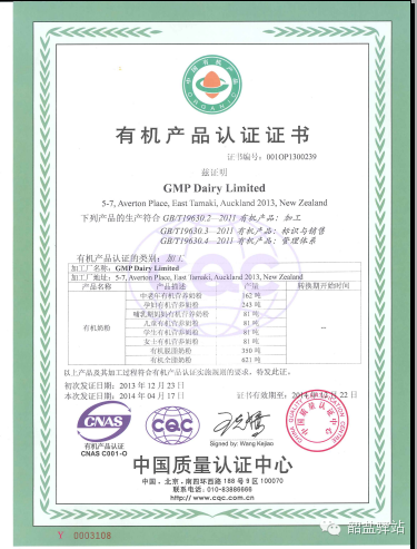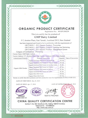 奥戈尼有机奶粉拥有新西兰农业与渔业部的出口证明书, 。