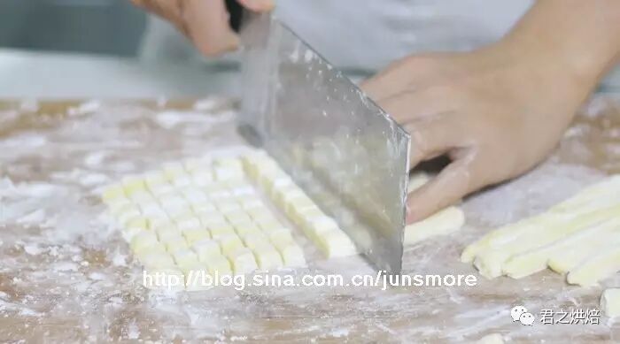 6、另一种懒人版整形方法,步骤如下。将面团擀开成厚度约0.5CM的片,撒上一些马铃薯淀粉防粘,将面片切成长条,再将长条切成小丁。