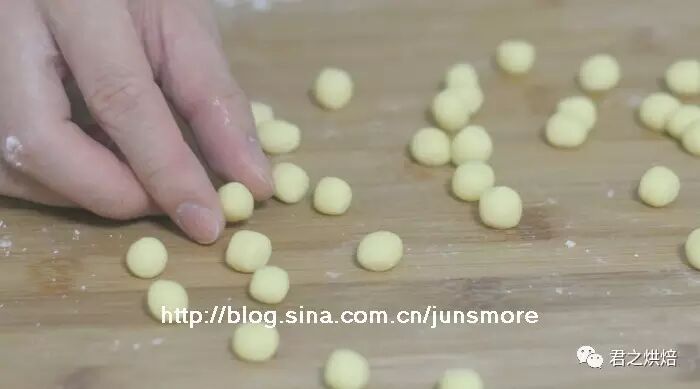 2、整个饼干的制作都十分简单。唯一复杂的是将面团整形成小圆球的步骤。制作过程里提供了两种整形方法,第一种能得到非常漂亮的圆形小球,但是十分费时。第二种大大节约了时间,但缺点是烤好的饼干表面可能会有薄薄一层残留的淀粉,而且也不能做到第一种方法那么圆。成品图上的小圆球是使用第一种方法整形而成。