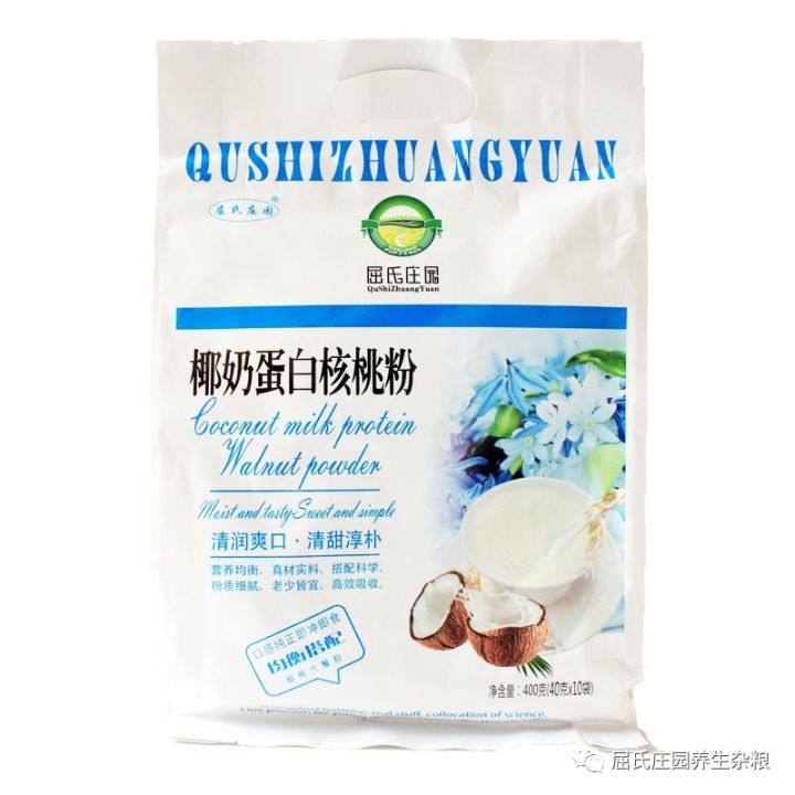 原料:原汁椰子粉、小米、玉米、核桃、大豆、黑芝麻、奶粉、大豆蛋白粉、木糖醇、麦芽糊精、三氯蔗糖、维生素C。